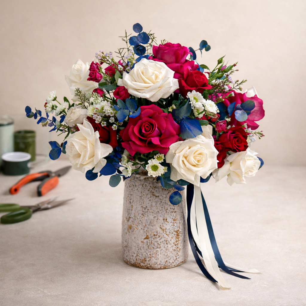 This arrangement features a rich blend of deep red and ivory roses, delicately layered with seasonal white fillers and fresh eucalyptus foliage. Styled in a textured ceramic vase and finished with soft satin ribbon accents, it brings warmth, sophistication, and refined charm to any space.